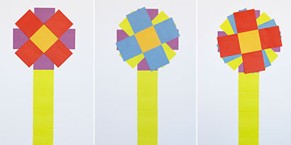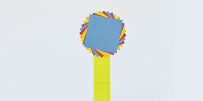 ประดิษฐ์ดอกไม้แบบนี้โดยการเอียงกระดาษ โพสต์- อิท® โน้ต แต่ละใบให้ทำมุมเท่าๆ กันวนไปเรื่อยๆ เหมือนกับที่คุณติดกระดาษเพิ่มลงไปยังพื้นที่สี่เหลี่ยมจัตุรัสของดอกไม้ก่อนหน้านี้ วงกลมวงหนึ่งมี 360 องศา ซึ่งถือว่ามีพื้นที่มากมายให้คุณได้ทดลองเล่น ลองดูซิว่าคุณจะวางกระดาษสี่เหลี่ยมจัตุรัสลงไปได้กี่แผ่นในดอกไม้รูปทรงวงกลมหนึ่งดอก !