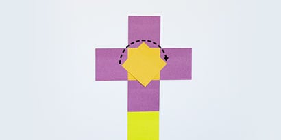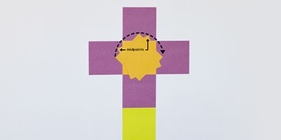 เริ่มวางกลีบชั้นที่ 2 โดยการติด โพสต์-อิท® โน้ต ใหม่ลงไปตรงกลางตามรูปด้านล่าง ให้มุมแหลมของกระดาษแต่ละมุมซ้อนทับตรงกึ่งกลางของกลีบดอกแต่ละกลีบ โดยให้มีพื้นที่เหลือเท่าๆ กัน จากนั้น คุณจะเห็นว่ามุมแหลมด้านบนนั้นวางอยู่ที่กึ่งกลางของเส้นประรูปวงกลม เหมือนกับทิศเหนือบนเข็มทิศ